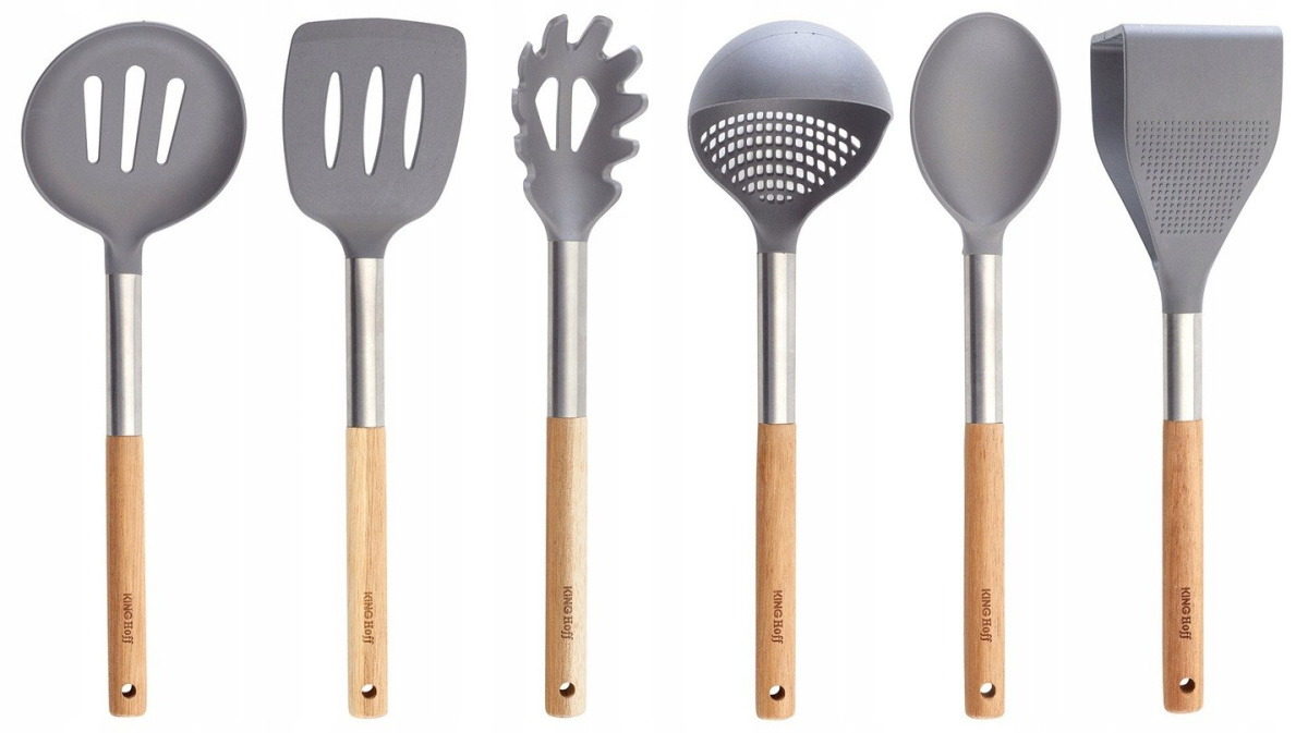 Zestaw przyborów kuchennych wykonanych z drewna akacjowego i nylonu termoplastycznego. Przybory dedykowane do naczyń z powłokami teflonowymi i ceramicznymi wrażliwymi na zarysowania.