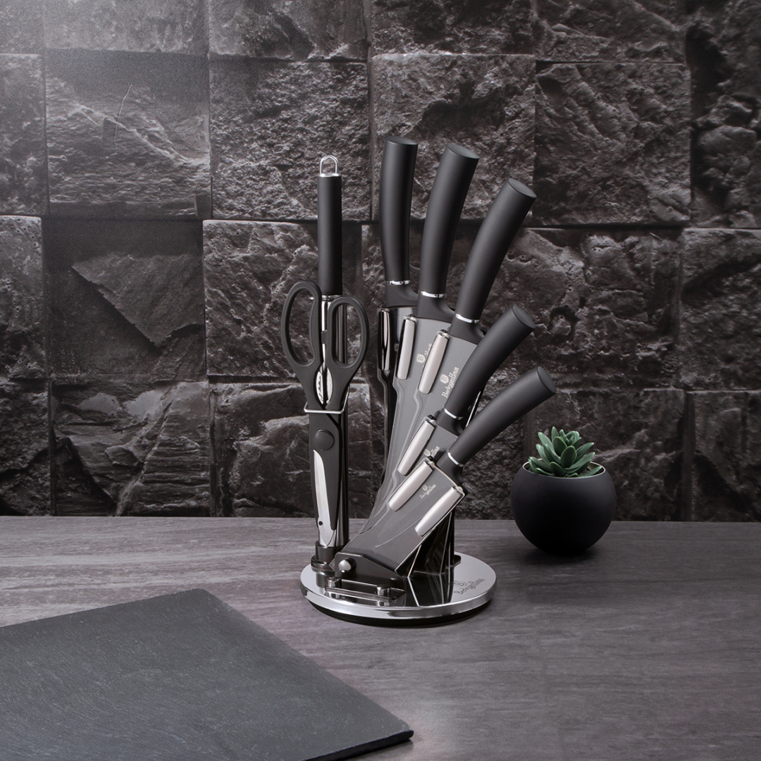 8 elementowy zestaw noży na stojaku firmy BERLINGER HAUS z serii Forest Line.Przeznaczone do porcjowania mięsa i ryb, krojenia pieczywa oraz obierania i siekania warzyw. Noże ze stali nierdzewnej dodatkowo pokryte powłoką nieprzywierającą non-stick. Wyposażone w uchwyty pokryte bardzo trwałą cienką warstwą silikonu dla uzyskania pewnego trzymania w każdych warunkach.