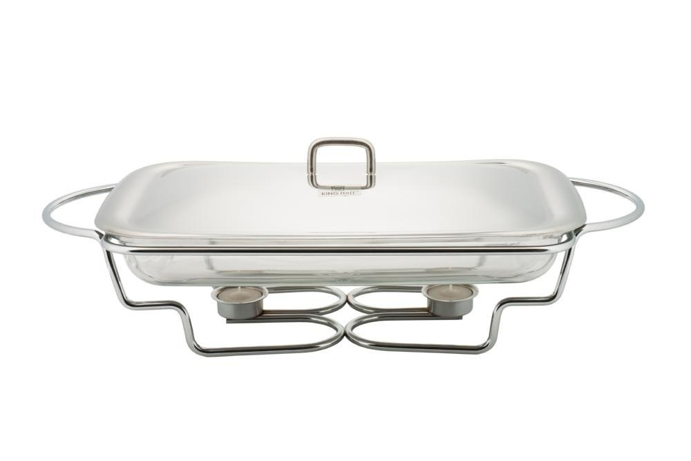 Szklany podgrzewacz do potraw. Pokrywa z wysokiej jakości stali nierdzewnej. Szklany wkład w metalowej podstawie. Dwie świece podgrzewające żywność. Nadaje się do zmywania w zmywarkach. Szklany wkład można używać w mikrofalówkach.