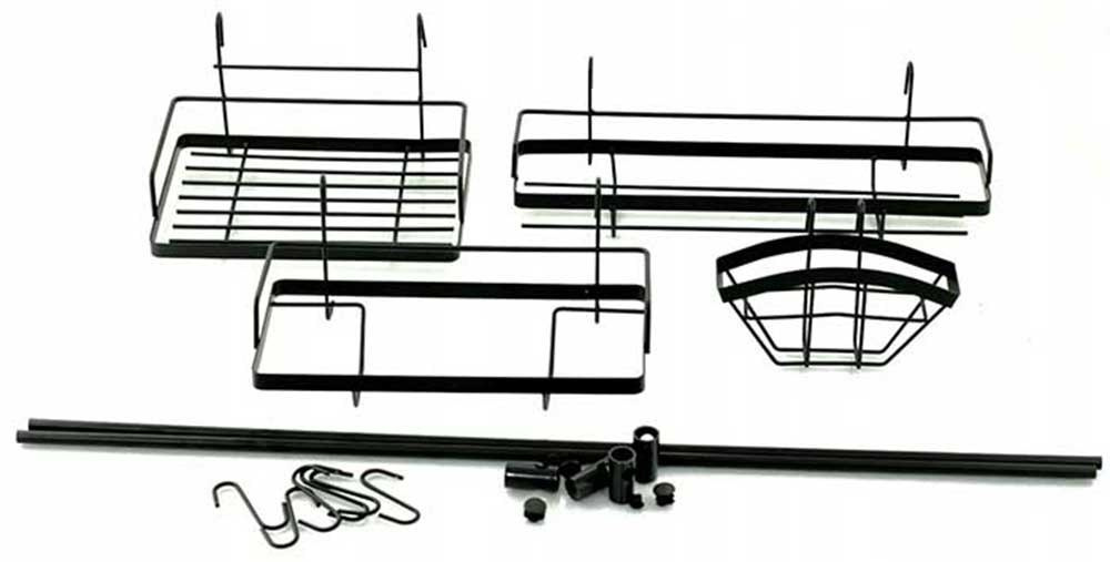 W zestawie: wieszak na ręczniki kuchenne z podajnikiem, 2 półki na przyprawy kuchenne, 6 wieszaków na narzędzia kuchenne, koszyk na serwetki/ filtry do kawy, 4 uchwyty mocujące, 2 rurki ze stali nierdzewnej. Całość wykonana ze stali lakierowanej w kolorze czarnym. Możliwość dowolnej konfiguracji.