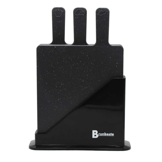 Zestaw desek do krojenia Brunbeste został zaprojektowany z myślą o codziennej wygodzie w kuchni. Wysokiej jakości materiał zapewnia trwałość. Zestaw umożliwia przechowywanie wielu desek jednocześnie. Oznakowanie pomaga wybrać deskę do odpowiedniego rodzaju żywności. Stojak sprawia że deski można wygodnie przechowywać przy czym nie zajmują dużo miejsca na blacie.