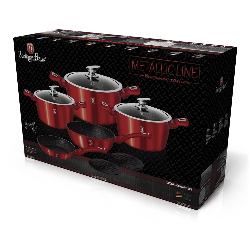Garnki i akcesoria z serii METALLIC firmy BERLINGERHAUS wykonane są z wysokiej klasy kutego aluminium pokrytego wewnątrz potrójną powłoką granitową (marble) o bardzo wysokim współczynniku twardości. Powłoka zewnętrzna występuje w kilku wersjach kolorystycznych o charakterystycznym metalicznym połysku. Te atrakcyjne i modne naczynia wyposażone są standardowo w uchwyty typu SOFT TOUCH (silikon handle). Przystosowane do wszystkich rodzajów kuchenek: gazowa, elektryczna, ceramiczna, halogenowa, indukcyjna. System TURBO INDUCTION (bardzo szybko nagrzewają się) pozwala zaoszczędzić nawet 35% energii.