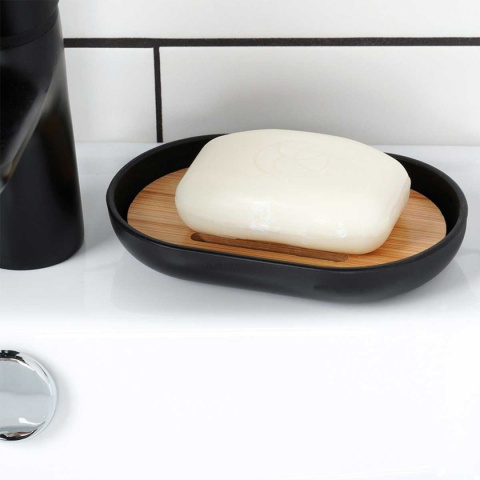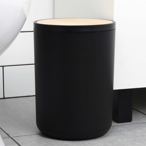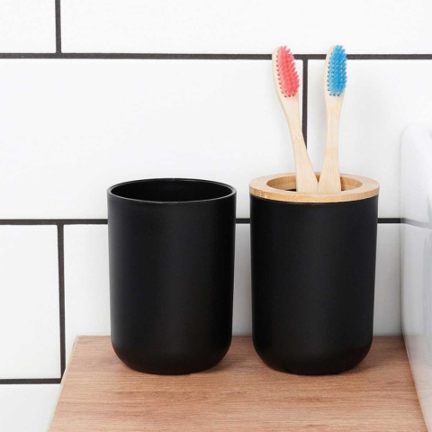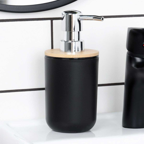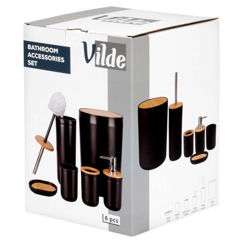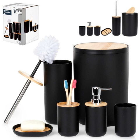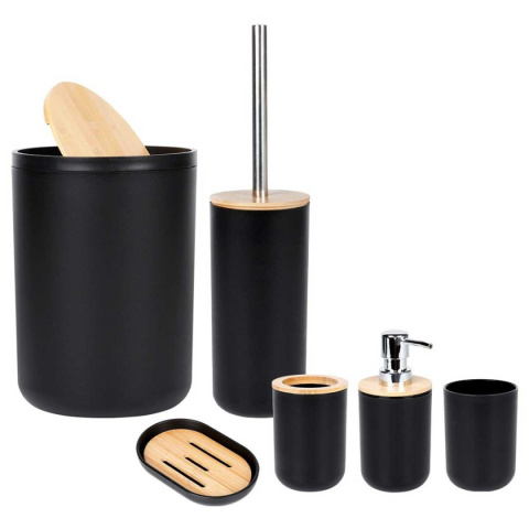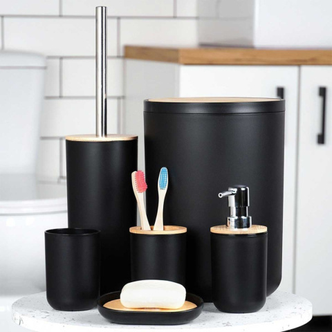 Przydatny zestaw akcesoriów łazienkowych w czarnym kolorze z elementami bambusowymi. Składający się z: dozownika na mydło, mydelniczki, 2x kubka, szczotki do WC oraz kosza na śmieci.