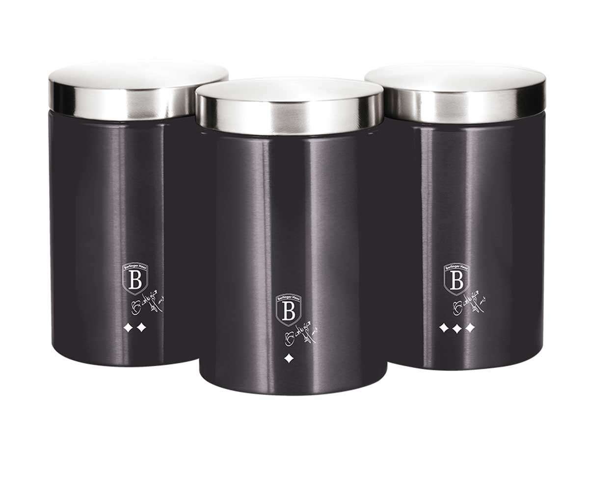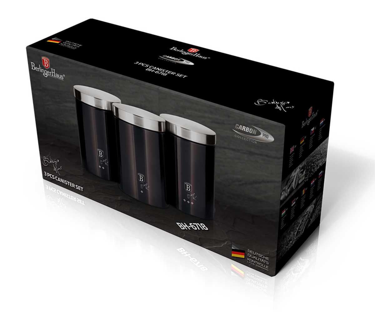 Zestaw 3  pojemników do przechowywania produktów sypkich takich jak kawa, herbata, cukier.  Pojemniki z linii CARBON PRO firmy Berlinger Haus.Wykonane ze stali lakierowanej na kolor grafitowy.