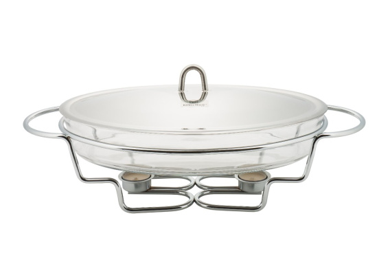 Szklany podgrzwacz do potraw. Pokrywa z wysokiej jakości stali nierdzewnej. Szklany wkład w metalowej podstawie. Dwie świece podgrzewające żywność. Nadaje się do zmywania w zmywarkach. Szklany wkład można używać w mikrofalówkach.
