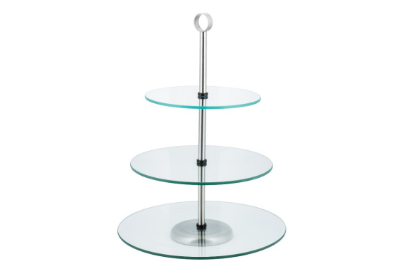 Elegancka, trzypoziomowa patera do ciast, kanapek, owoców lub przekąsek. Wykonana ze szkła hartowanego oraz satynowanej stali nierdzewnej.