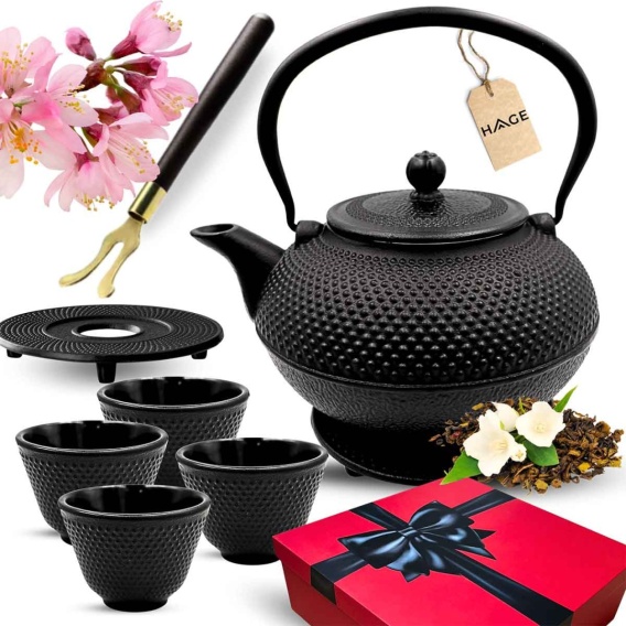 Żeliwo doskonale zatrzymuje ciepło, a emaliowana powłoka ułatwia utrzymanie czystości i poprawia estetykę. Czajnik wyposażony jest w ergonomiczny uchwyt oraz pokrywkę, a w zestawie znajdują się czarki, które umożliwiają komfortowe picie herbaty.