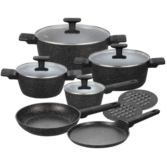 12-elementowy zestaw garnków marmurkowych w kolorze czarnym ze szklanymi pokrywami to kompletny i funkcjonalny zestaw kuchenny, idealny do przygotowywania różnorodnych dań. Dzięki eleganckiemu wyglądowi oraz solidnemu wykonaniu jest zarówno praktyczny, jak i stylowy. Poniżej szczegółowy opis elementów zestawu i ich właściwości.