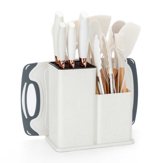 Zestaw 19-elementowy noży kuchennych oraz przyborów wraz z deską do krojenia w stojaku to kompletny i elegancki zestaw do każdej kuchni, który ułatwia codzienne przygotowywanie posiłków. Zestaw zawiera różnorodne noże do różnych zadań kuchennych – od krojenia chleba, przez porcjowanie mięsa, po siekanie warzyw, a także deskę do krojenia, zestaw łyżek i szpatuł, pędzelek silikonowy, ubijaczkę, szczypce, nożyce, które zwiększają jego funkcjonalność. Zestaw przyborów kuchennych wykonanych z drewna kauczukowego i nylonu termoplastycznego. Przybory dedykowane do naczyń z powłokami teflonowymi i ceramicznymi wrażliwymi na zarysowania. Część nylonowa odporna na temperaturę do 200°C
