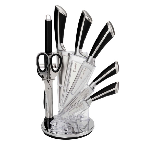 • ZESTAW 9 ELEM. NOŻY KUCHENNYCH W STOJAKU Z OSTRZAŁKĄ I NOŻYCAMI E-6263