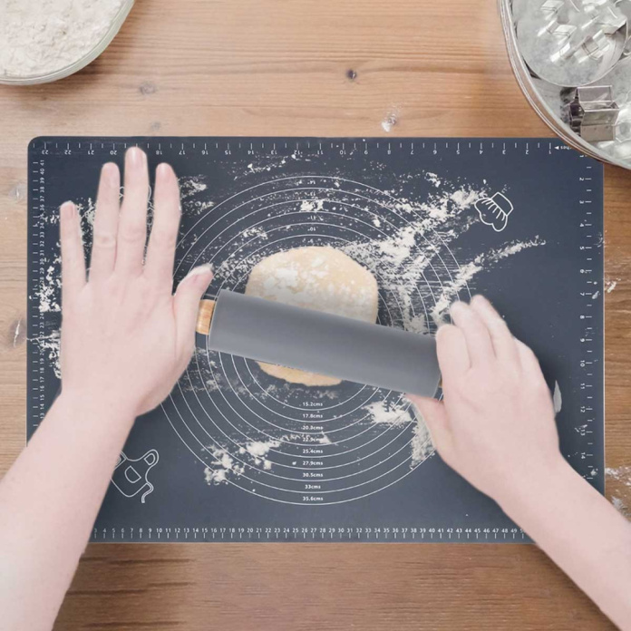- Przydatny w każdej kuchni - Zestaw sprawdzi się do wyrabiania i wałkowania ciasta na pierogi, makaron, pizzę, wyroby cukiernicze itd. Z jego pomocą wałka uzyskamy odpowiednią grubość przygotowywanego ciasta. Stolnica sprawdzi się także jako mata do pieczenia w piekarniku. Dodatkowo, matę można użyć do zawinięcia ciasta i przechowywania go w lodówce lub zamrażarce.